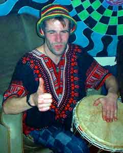 Rainbow-hatted hippy on drums