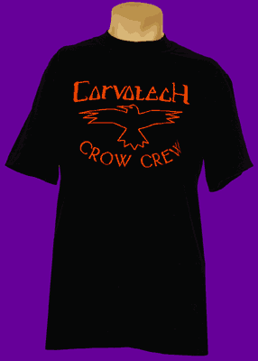 Corvotech Teeshirt with 'Caw! If you love bleak black vinyl' on back black shirt with design in bright fluoro orange